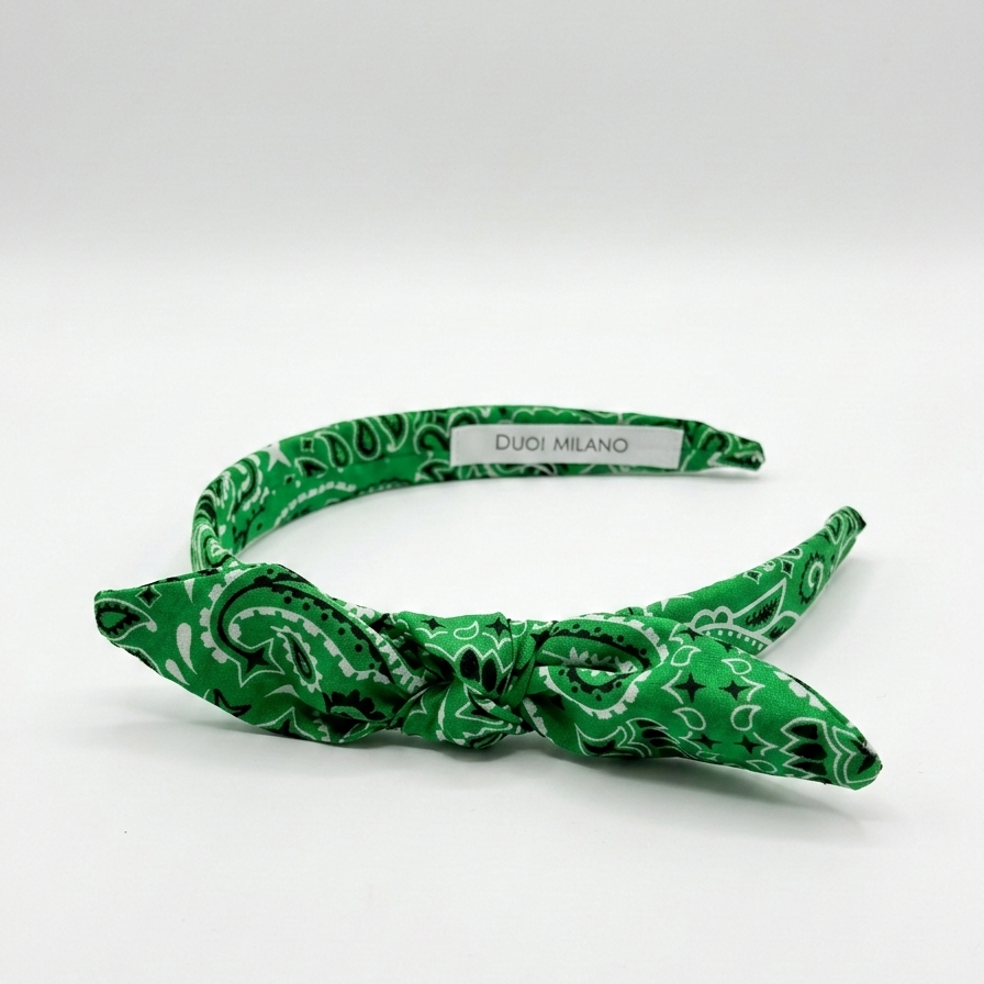 Cerchietto realizzato a mano con cura artigianale, impreziosito da un fiocco annodato e facilmente sfilabile, per offrire massima versatilità.